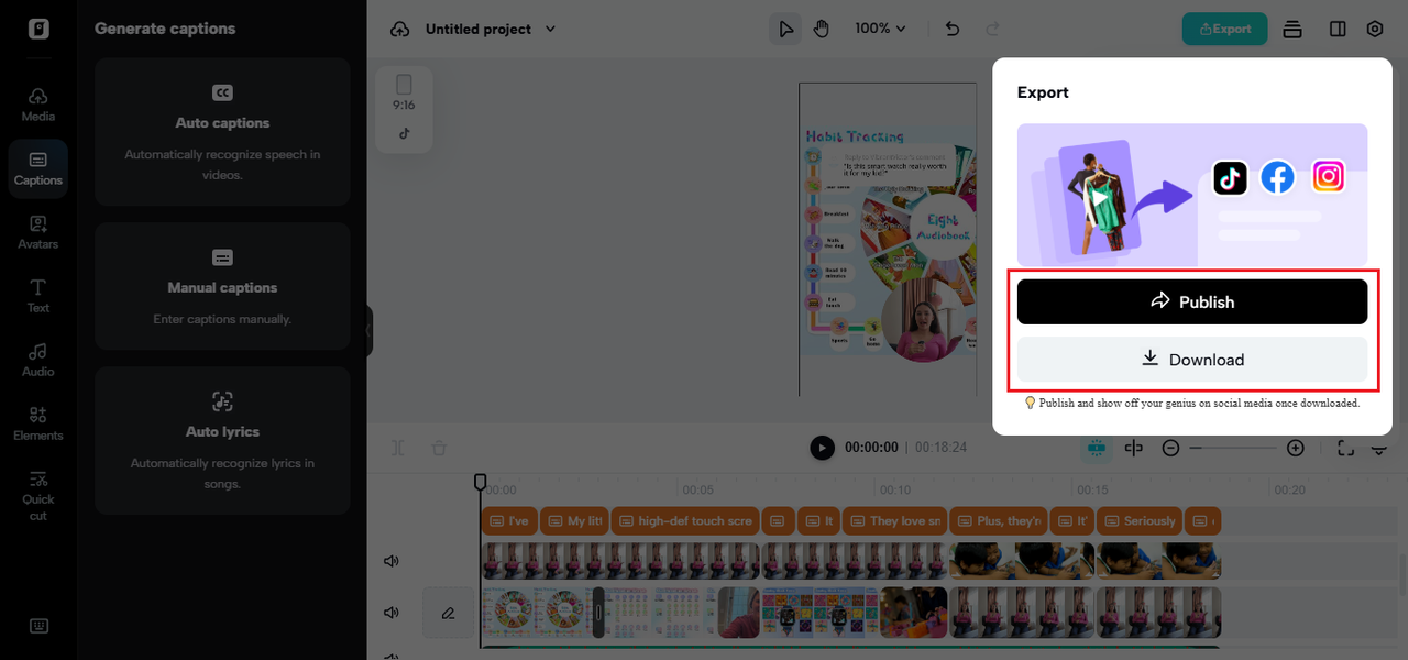 After your images have been uploaded, Pippit will intelligently default create a preview with auto-selected visuals. Now make it your own! Edit the timeline, fine tune the captions, and pick transitions that fit your vibe! You can even give it a specific AI avatar to narrate your video. Then hit "Generate" and let Pippit publish your content for you.