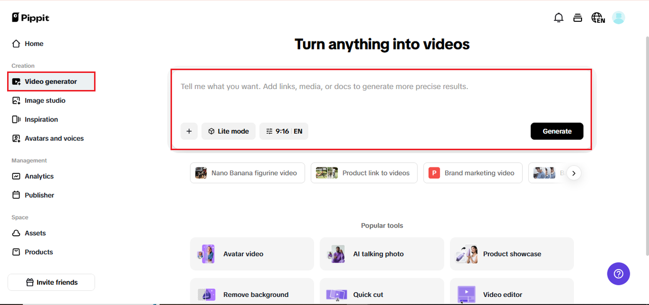 You can create an account or log in to your Pippit account. Once you are logged in, select the "Video generator" option and then click "Add media" to upload images from your device or cloud storage. You can also add a product URL, and Pippit will automatically find images from it. Then hit Generate to create your video. It's that simple! No editing dashboard. No complicated setup. Just upload and the tool will generate your foundational video for you.